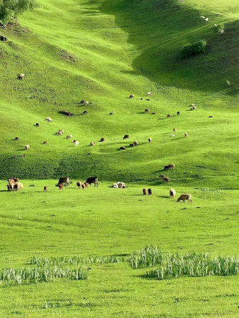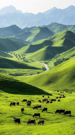 the serene pasture, bathed in warm sunlight, stretches towards the horizon, where rolling hills meet a clear blue sky, featuring a herd of grazing cattle and horses, surrounded by lush green grass and wildflowers, evoking a sense of peaceful rural landscape and idyllic countryside scenery. ai generated
