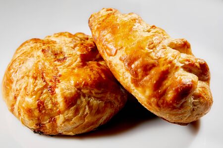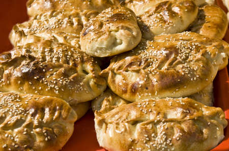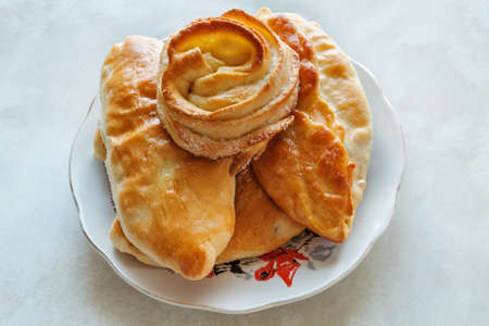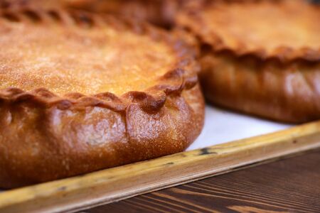 national bakery. A pie with cabbage. Pies with stuffing on the table. Cuisine of the countries of the world. Turkic cooking
