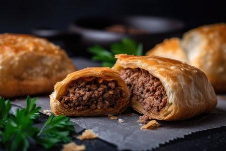 close-up view of a freshly baked bourekas filled with spiced ground beef and aromatic herbs, with a crispy exterior and steam rising from the center, AI Generated