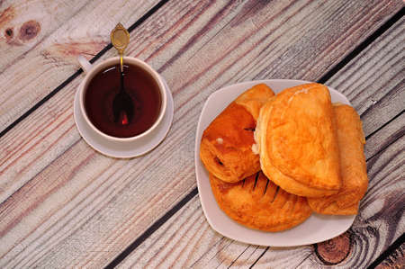 Puff curd buns on a ceramic plate and a cup of black tea on a wooden table. Top view, flat lay.