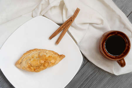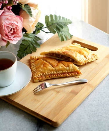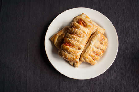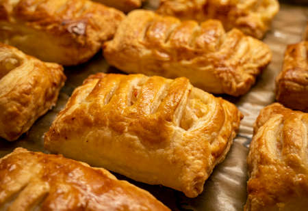 Homemade pastries freshly baked puff pastry puffs with apples on baking paper close-up. Bakery products