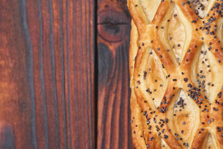 Baked bun with flaky pastry sprinkled with poppy seeds on a dark wooden background. Close-up. Food background.