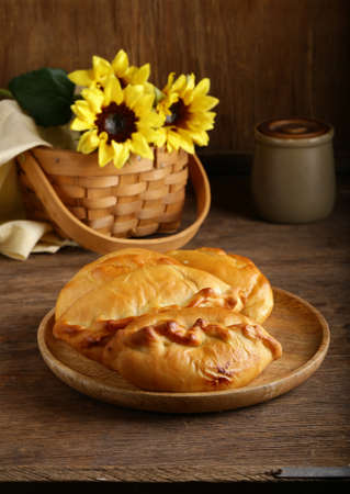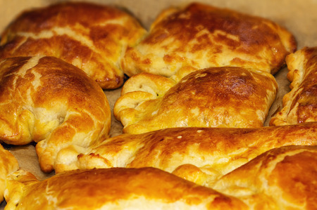 homemade pastries with fillings of potatoes, cabbage and fish, in the composition on a textured background