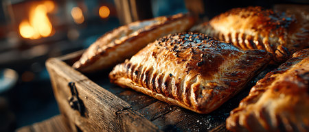 Golden brown pastries rest on a rustic wooden surface near a warm fire showcasing a deliciously inviting texture and aroma.