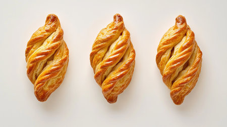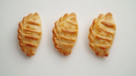 A visually appealing arrangement of three golden brown pastries, showcasing intricate crust designs and tempting textures on a clean white surface. Perfect for any culinary or food-related project.