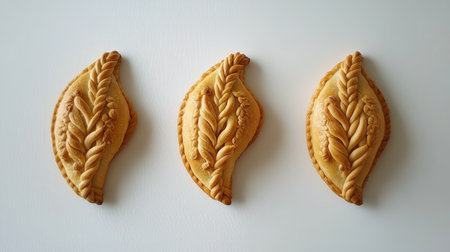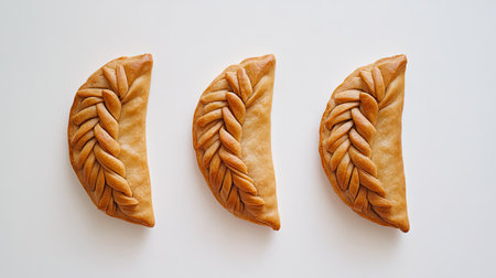 A tempting trio of golden empanadas, beautifully braided and baked to perfection. Ideal for enhancing your culinary collection or showcasing delicious treats.