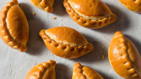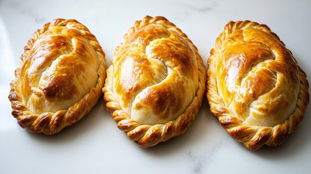 Three golden brown empanadas showcase detailed patterns on a clean surface. Ideal for food photography, culinary presentations, or recipe promotion.