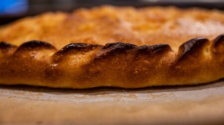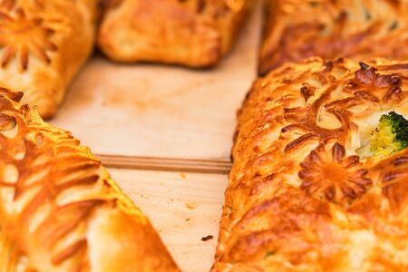 Delicious puff pie stuffed with chicken breast. Closeup of pie crust. Macro. Photo can be used as a whole background.