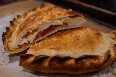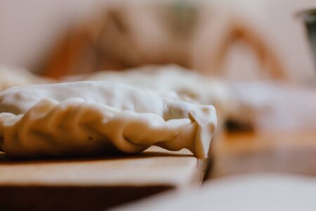 Kibinai, traditional Lithuanian food, pastries filled with sweet cottage cheese, popular with Karaite ethnic minority in Trakai, Lithuania. Red background.