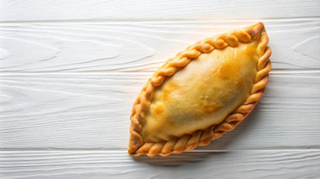 High-quality image of a freshly baked empanada on a rustic wooden table, ideal for food blogs, recipe books, and culinary projects.