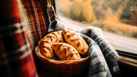 A basket of freshly baked pastries wrapped in a cozy blanket, placed by a train window with a scenic autumn view outside, capturing a warm and nostalgic travel moment.