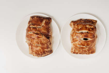 Lymington, UK - July 14, 2019: Cornish pasties on sale at a Mines A Pasty shop in Lymington, UK. Cornish pasty is a traditional British food particularly associated with Cornwall and Devon.