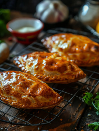 Enjoy this trio of golden empanadas, freshly baked and beautifully presented. Ideal for appetizers or snacks, these savory pastries delight the palate.