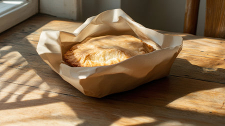 A freshly baked pastry wrapped in paper rests on a rustic wooden table, illuminated by warm natural sunlight, creating inviting shadows in a cozy indoor environment.