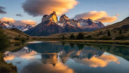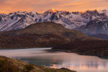 The Torres del Paine National Park sunset view. Torres del Paine is a national park encompassing mountains, glaciers, lakes, and rivers in southern Patagonia, Chile.