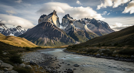 Mountain landscape with a river in the foreground, Torres del Paine National Park, Chile