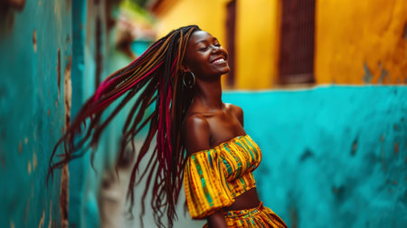 Energetic cool African woman with colorful dreadlocks dancing on the street. Generative AI.
