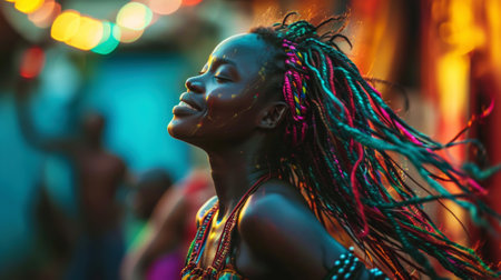 Energetic cool African woman with colorful dreadlocks dancing on the street. Holi Diwali celebration. Generative AI.