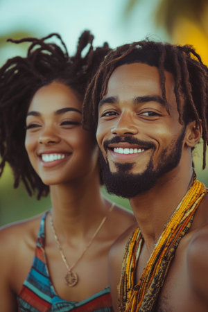 A happy couple poses at the beach during sunset, showing their beautiful natural hairstyles and colorful outfits. They exude joy and connection, with the ocean in the background.