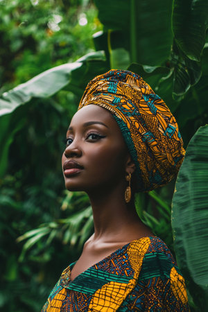 A striking portrait of an elegant African woman standing confidently amidst the lush verdant foliage of the jungle Adorned in a vibrant patterned headwrap and striking tribal inspired accessories