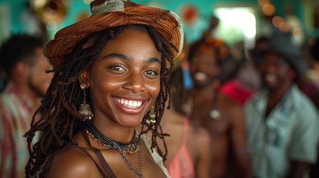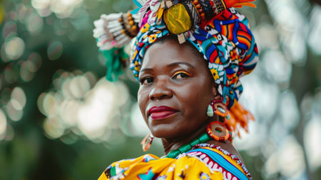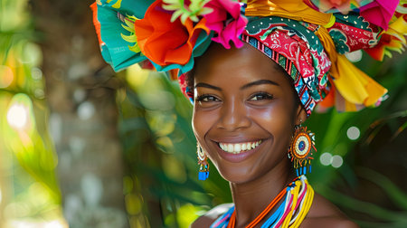 Vibrant tropical portrait of a smiling dark-skinned young woman with colorful headwear