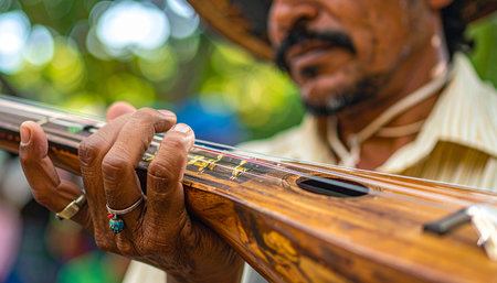 With focused passion, a musician's hands move skillfully along the fretboard of his traditional wooden instrument.