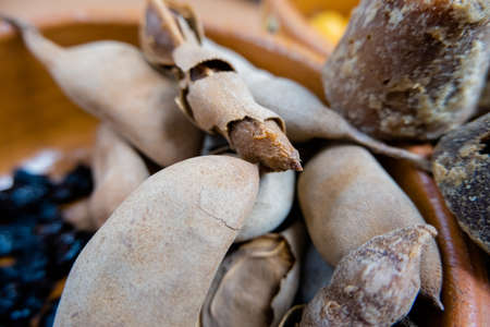 Fresh tamarind and raisins in clay bowl next to brown sugar canes