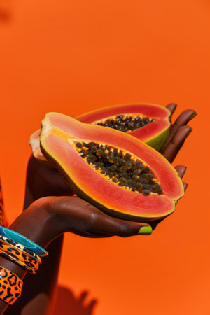 A papaya half with seeds held in a hand, contrasted on an orange surface