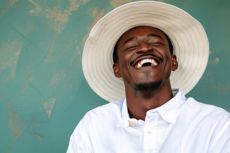 Portrait of a happy man with a big smile wearing a white hat and shirt against a green background.