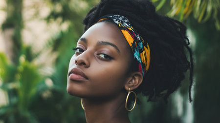 A confident woman with natural dreadlocks and a colorful headband, posing against a lush green background