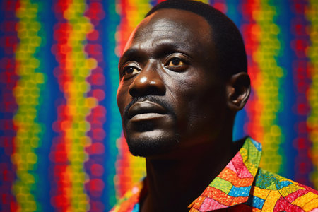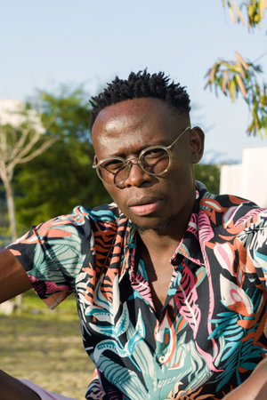 Portrait of a handsome African man in a colorful shirt looking at camera