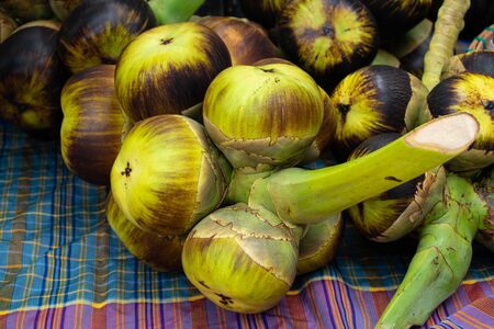 It is Borassus flabellifer, commonly known as doub palm, palmyra palm, tala palm, toddy palm, wine palm, or ice apple is native to the Indian subcontinent and Southeast Asia