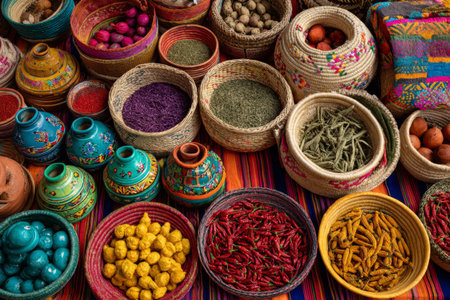 Flat lay of traditional Mexican market stall with woven baskets filled with dried chili peppers, nuts and spices on colorful textile. Concept of local food, culture and traditional crafts