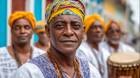 Afro brazilian men wearing traditional clothes and turbans performing outdoors with drums