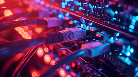 Closeup of network cables plugged into data center equipment glowing with vibrant lights technology concept