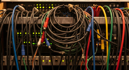 A close-up of a tangled mess of colorful audio cables and wires plugged into the back of a rack-mounted sound equipment unit. The complex and chaotic wiring with various connectors like XLR and RCA represents the backend of a recording studio, live sound setup, or broadcast room.