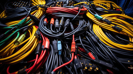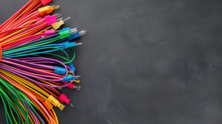 A striking arrangement of colorful cables on a dark background, showcasing creativity in technology and design. Perfect for media, marketing, or creative projects.