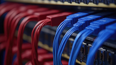 A vibrant close-up of a patch panel in a modern network rack, showcasing cables and connections. The colorful illumination adds depth to the technology theme.