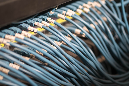 Fiber Optic cables connected to network switch in data center room