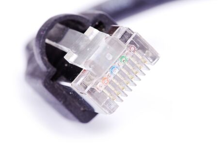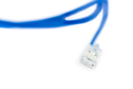 Blue ethernet cable rj-45 plug connector closeup isolated over white
