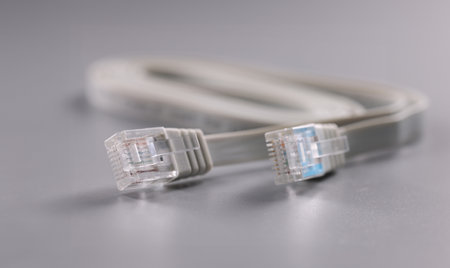 White internet connectors placed on grey surface, cable with plastic clip at tip