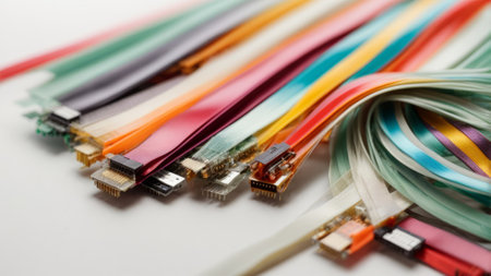 A bright arrangement of multicolored cords stacked neatly on a solid blue background, perfect for creative projects and artistic endeavors. The vibrant hues add a playful element to any design.