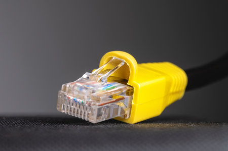 RJ45 network plug close-up on a gray background. plug 100 mb
