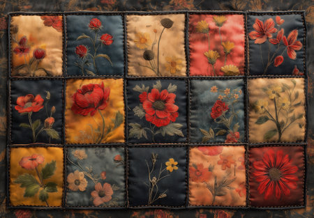 patchwork design, visually stunning and eclectic look created by varied shapes and sizes of quilted fabric patches on this patchwork print design