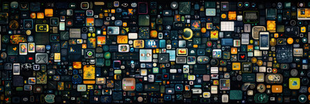A visually striking abstract background featuring colorful app icons displayed on a dark surface, perfect for technology and digital media themes.