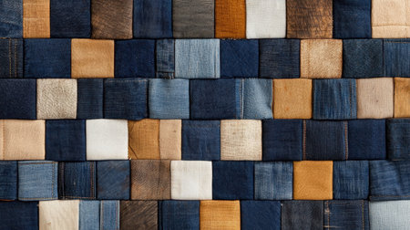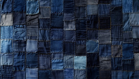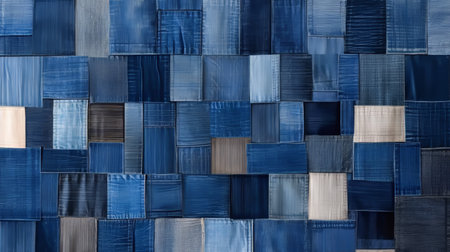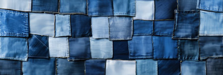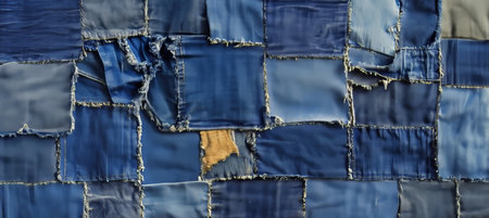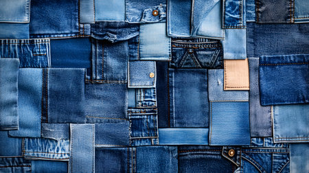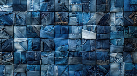 Background of intricately patched blue denim fabrics, showcasing a sustainable approach to fashion.