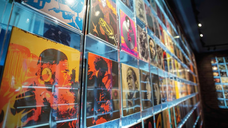 Artistic display of posters, vinyl records, and photographs creating a lively atmosphere filled with music and pop culture references.