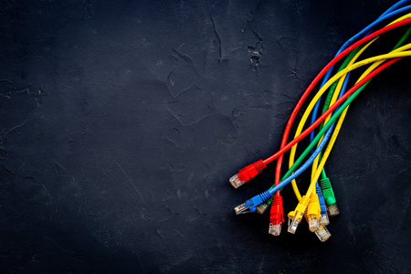Rj45 cords on the stage. Computer accessories used in network connections. Black background.