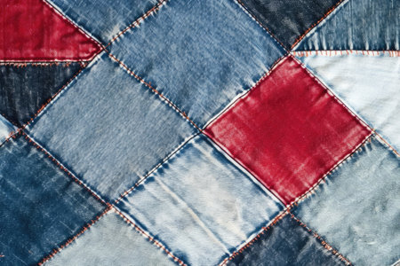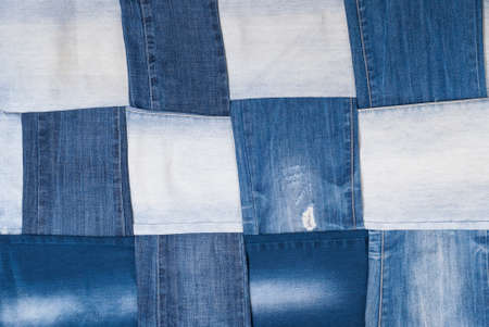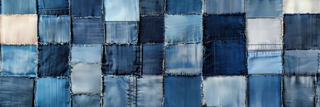 Blue Denim Patchwork Texture Background, Sustainable Fashion Concept, Recycled Jeans Fabric Pattern