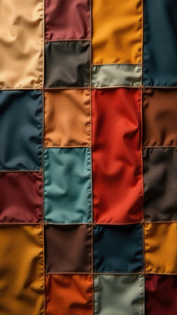 A colorful geometric design created with various fabrics, highlighting texture and pattern in a fashion setting.
